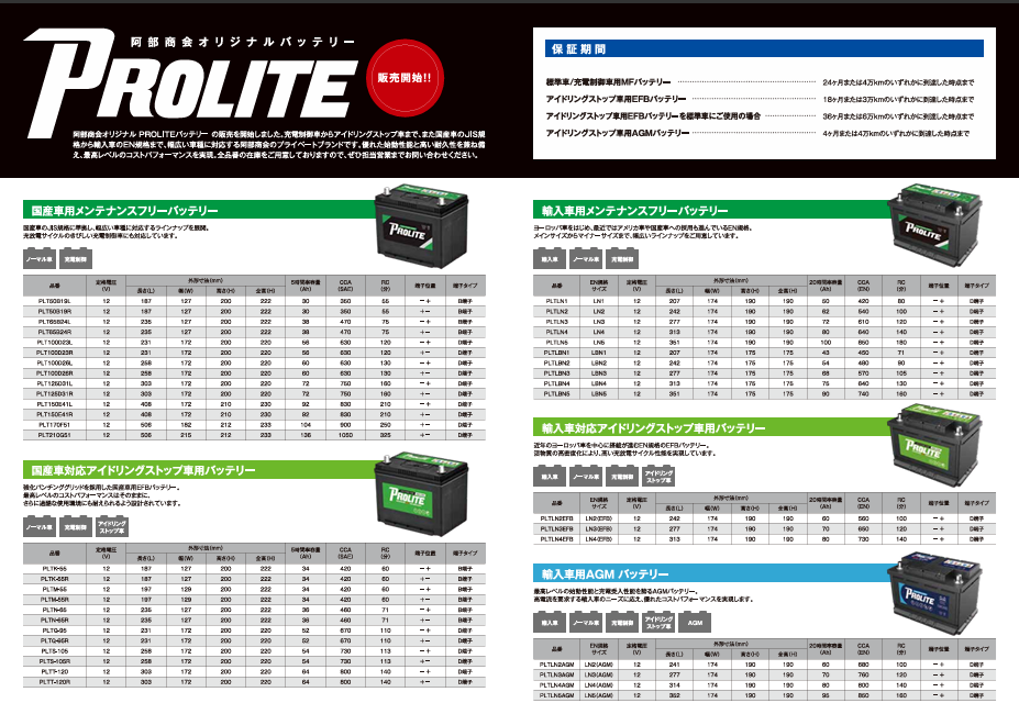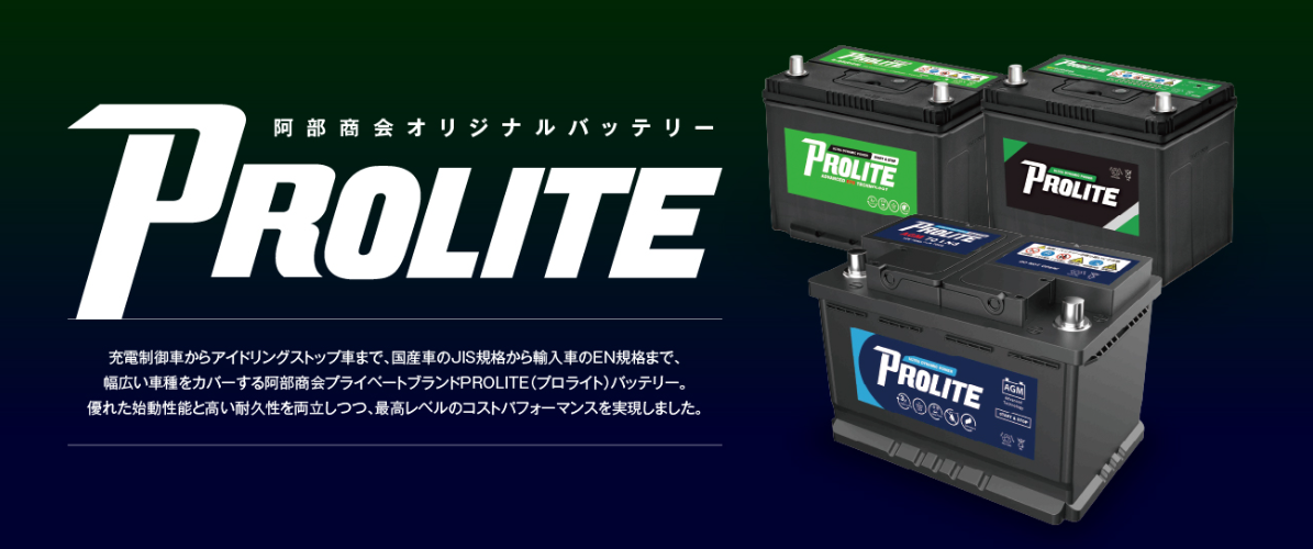PROLITE(プロライト)は、高性能・高耐久・高コスパを実現。国産車も輸入車もカバーする阿部商会プライベートブランドバッテリーです。